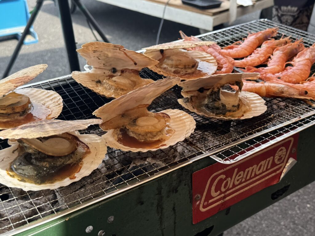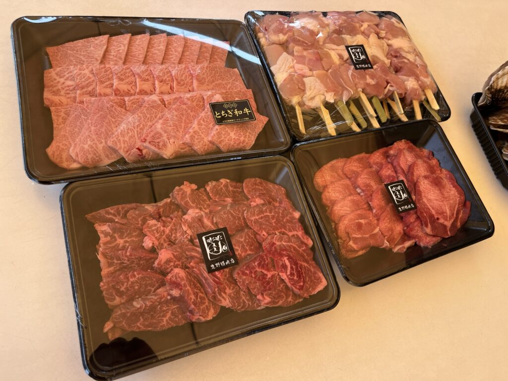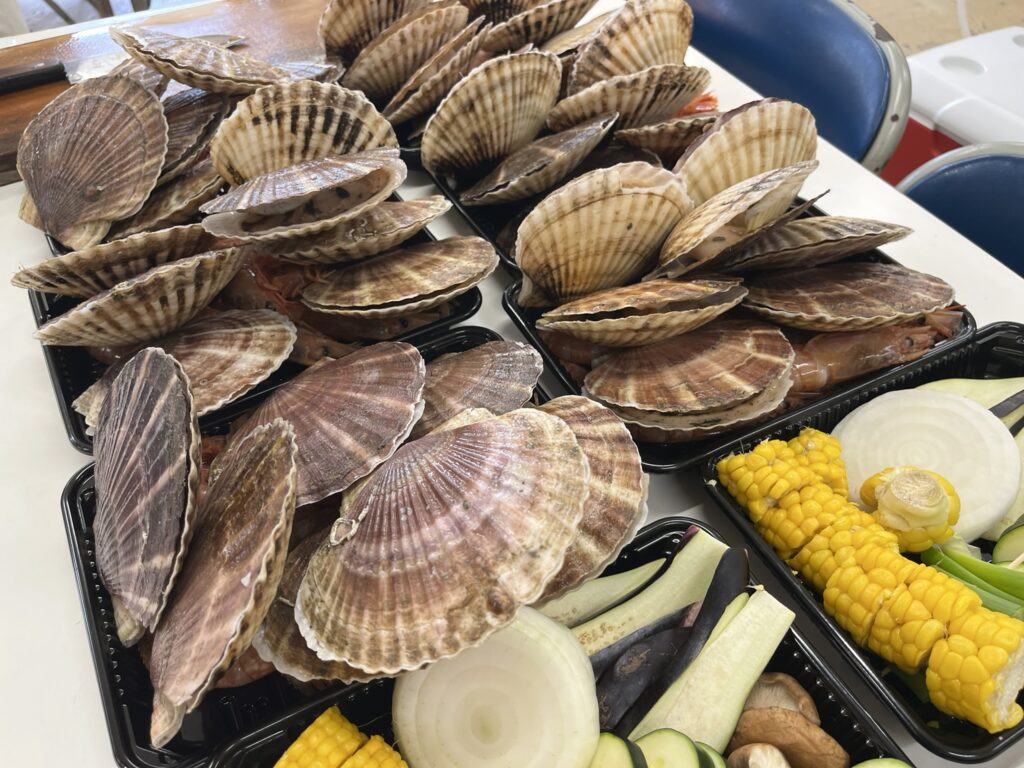 地元の名店「鹿野精肉店」さんの特選和牛をはじめ、ホタテ・エビの海鮮、焼き鳥に、「社員提供の鮎の塩焼き」まで豪華ラインナップ!